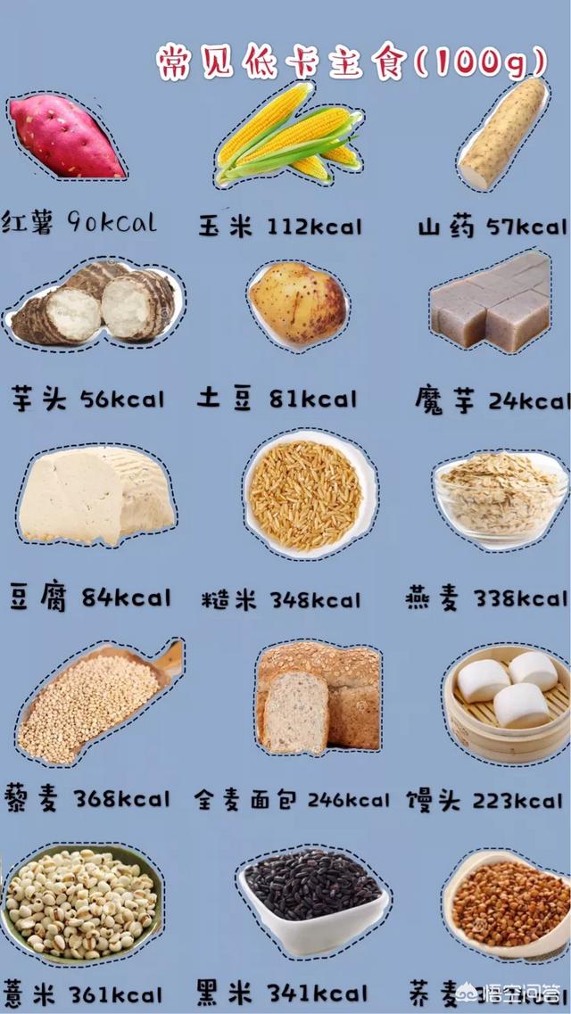 一般的な低カロリーの主食としては、トウモロコシ、ヤムイモ、タロイモ、緑豆、サツマイモ、ジャガイモ、全粒粉パン、オーツ麦、玄米、こんにゃく、豆腐、キヌア、肉まん、そば、大麦、黒米などがある。