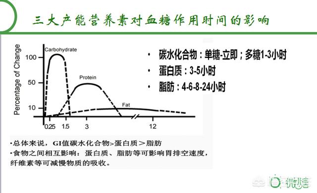(1)炭水化物は血糖に影響を与える最も重要な因子であり、その約90~100%が血糖に変換される。影響を及ぼす時間は即座に3時間である。単糖類(ブドウ糖など)は糖度が早く上がり、多糖類(饅頭、米など)は糖度がゆっくり上がる。