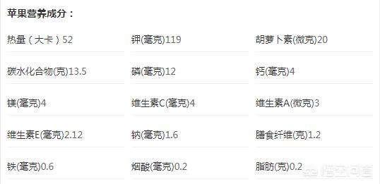 リンゴには、糖質、食物繊維、ビタミンA、ビタミンC、カロテン、リンゴ酸、鉄、リン、カリウム、マグネシウム、セレンなどの栄養素が含まれている。リンゴに含まれるポリフェノールとフラボノイドは、肺がんの発生を抑え、鉛中毒を予防する。リンゴに含まれるフルーツ酸とビタミンは、人々の肌をデリケートで潤いのあるものにし、加齢によるシミの出現を遅らせるのに役立つ。