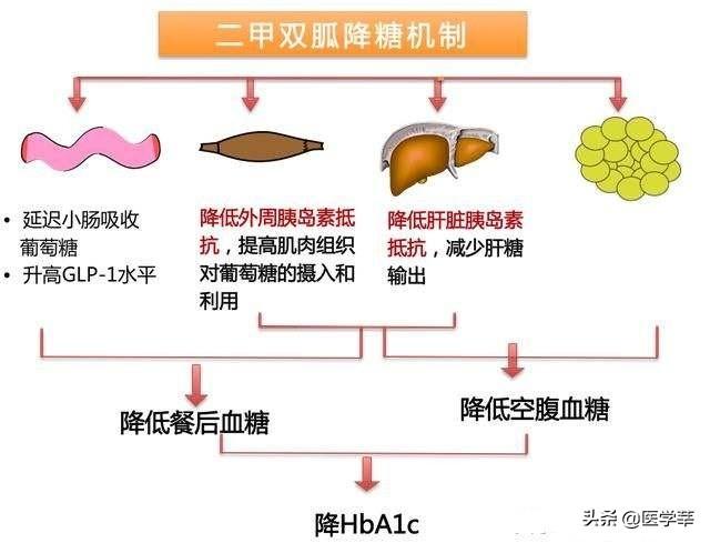 メトホルミンは、肝グルコース異化および肝グルコース産生を効果的に減少させ、嫌気性条件下での解糖を促進し、筋肉などの末梢組織によるグルコースの取り込みと利用を増加させ、脳、血液細胞、骨髄、腸および皮膚によるグルコースの利用を増加させることができる。これにより、血中グルコースを効果的に減少させる。