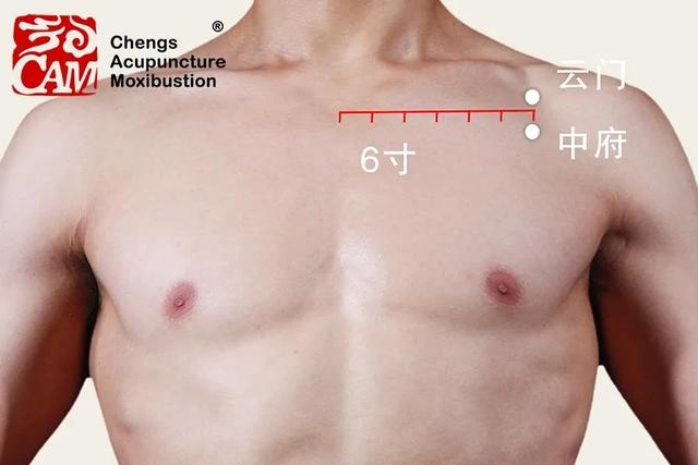 中府点、水平に平らな第一肋骨の隙間、前正中線から6インチ。腕を組んで直立し、鎖骨外側端の下端にある三角形の窩の中心を雲門点とし、この窩の中心から肋骨1本分下に垂直に押し下げる(第一肋間を水平にする)。