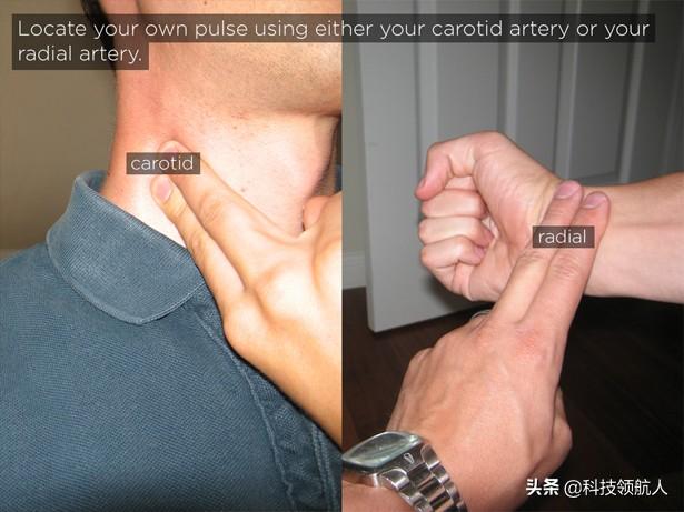 心拍数の速さは、まず自分の脈拍を測ることで知ることができる。 脈拍とは、心臓の鼓動に反応して動脈血管が出す拍動のことで、体内の動脈があればどこでも脈拍がある。心臓が "鼓動 "するたびに全身の脈拍が1回拍動するので、脈拍は心臓の拍動を反映するバロメーターである。脈が速いということは心臓の鼓動が速いということであり、脈が遅いということは心臓の鼓動が遅いということです。脈拍を調べるには、人差し指と中指をもう片方の手の手首の上に置き、高くなった屈筋頭の下側近くのくぼみにある屈筋動脈に触れる。
