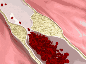 血管内のプラークは、単に内腔を小さくして血流を悪くするだけではない。プラーク表面の血管内膜は安定しておらず、破裂しやすい。プラークが破裂すると、不溶性脂質を放出して塞栓を形成し、塞栓は血液とともに遠位動脈に移動して血栓を形成する。脳で起これば脳梗塞、心臓で起これば心筋梗塞となる。