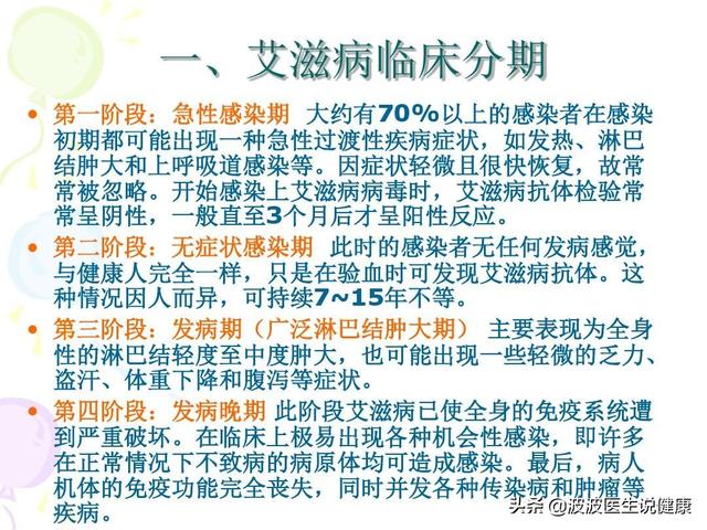 AIDSの潜伏期間は短いもので数ヶ月、長いもので15年で、平均潜伏期間は8〜10年である。急性期、無症状期、エイズ期の臨床病期分類。HIV感染症のAIDS期は、最終期の後、体の免疫細胞の機能が障害され、その結果、独特な臨床症状が出現し、この時、抗レトロウイルス治療はウイルスの複製を最大に抑制するだけで、ウイルスを完全に殺すことはできない。エイズの死亡率は非常に高く、1年で50%、3年で80%、5年でほとんど死亡する。平均生存期間は12~18ヵ月である。