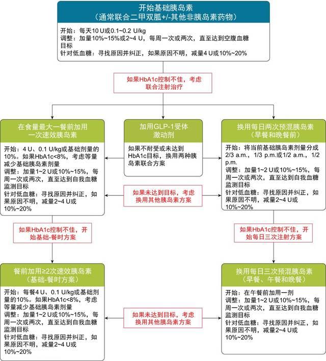 2.T2DM患者では、生活習慣の改善や経口薬併用療法を行っても血糖値が目標値に達しない場合、あるいは経口薬併用療法に禁忌がある場合に、インスリン単独療法や経口薬併用療法を開始することがある。通常、2種類以上の経口薬を大量に併用した後、HbA1cが7%を超えた時点でインスリン治療を開始することができる。