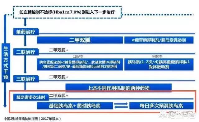 糖尿病の初期や糖化ヘモグロビンが7.0mmol/L未満の患者には、当面は経口血糖降下薬やインスリン療法は必要なく、まず運動療法と食事療法で血糖をコントロールする。食事療法や運動療法を行ってもなお血糖が基準値に達せず、糖化ヘモグロビンが7.0%以上の場合は、生活習慣の介入を基本として経口血糖降下薬療法を開始する。薬物療法は、メトホルミン、α-グルコシダーゼ阻害薬、スルホニル尿素のいずれか1剤の投与から開始されるが、メトホルミンが望ましい。メトホルミン単独療法でも血糖が基準値に達しない場合は、メトホルミンを基本として、α-グルコシダーゼ阻害薬、スルホニル尿素薬、グリクラジド薬、GLP-1受容体作動薬、DDP-4阻害薬、SGLT-2阻害薬など、血糖降下作用の異なる薬剤を組み合わせて血糖を下げる。2剤併用療法を行ってもなお血糖が基準値に達しない場合は、2剤併用療法を基本として、血糖降下作用の異なる薬剤の3剤併用療法を追加することができる。それでも血糖が基準値に達しない場合は、インスリン療法を開始する:基礎インスリン+食事時インスリン、または1日2~3回のプレミックスインスリン。