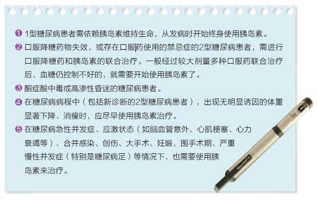最後に、糖尿病患者が次のような状態にある場合にインスリンが必要となる:高浸透圧昏睡、ケトアシドーシス、乳酸アシドーシスなど;重症の下痢、嘔吐、増殖期の糖尿病網膜合併症などの重篤な合併症と高血糖の患者;肝機能不全と腎機能不全と高血糖の患者;手術を受ける必要がある患者、妊娠中と授乳中の糖尿病患者;重症の外傷、感染症、心臓病、急性の血管変化などの患者。手術が必要な糖尿病患者、妊娠中、授乳中の糖尿病患者、重症外傷、感染症、急性心疾患、急性脳血管病変などの患者。
