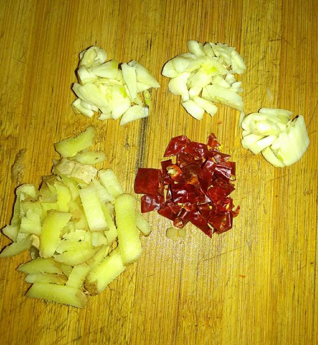 炒めるたびに、ニンニクを2、3片入れて包丁で刻み、赤唐辛子と生姜の塊を混ぜて一緒に刻む。