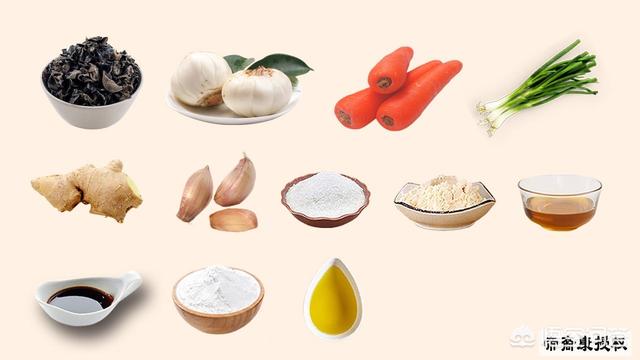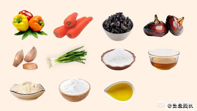 材料:カラーピーマン100グラム、ニンジン100グラム、キクラゲ50グラム、カブト90グラム、ニンニクとネギ少々。