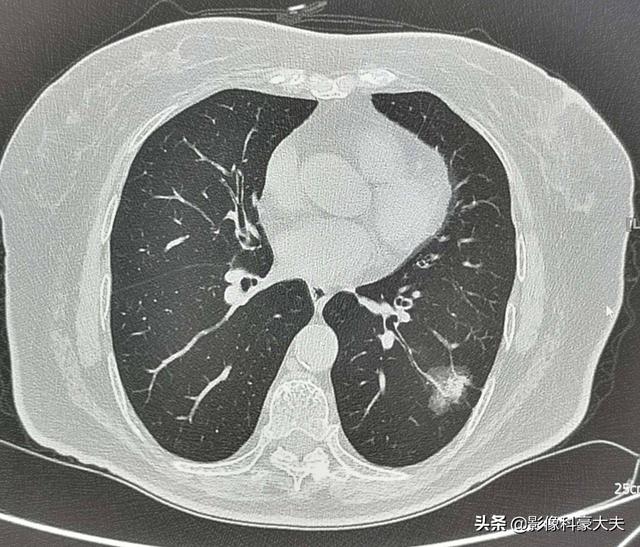 例えば、左下肺に2.2cmの混合膜ガラス結節があるこの中年女性は、リスクの高い結節であり、実際、肺腺癌の典型的な徴候を有している。血管の進入と肥厚を伴う明瞭な地硝子影、気管支気腹徴候、遠位胸膜浸潤、浸潤性肺腺癌の外科的病理所見このような病変は経過観察には勧められないので、転移や治療の遅れを避けるために、さらに詳しく調べてはっきりさせる必要がある。