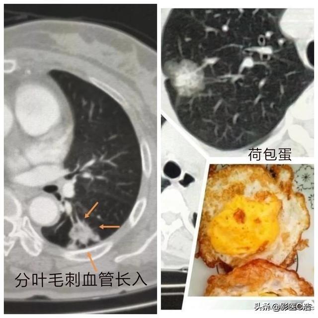 結節が悪性であれば、通常、不規則な形、小葉状(腫瘍細胞があらゆる方向に不規則に増殖する)であり、空胞症状、辺縁バリ徴候、腫瘍に供給する血管の徴候、隣接する胸膜の陥凹の徴候、経過観察による地塊結節や固形成分の増大などが認められる。瘢痕がんでは、場合によっては明らかな三日月シャベル徴候も認められるが、悪性の地塊結節では、典型的なフリルエッグ徴候が認められるものもある。