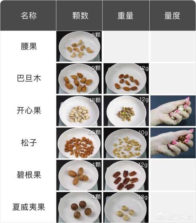 《中国人のための食事ガイドラインナッツ類は一人当たり週に50~70粒が適当とされており、一日当たりおよそ10g、糖尿病患者も同様である。具体的には、殻をむいたヒマワリの種なら1日20~25g、つまり手のひら1杯半、ピーナッツなら15~20g、つまり平均的な人なら手のひら1杯、クルミなら2~3粒、クリなら4~5粒に相当する。