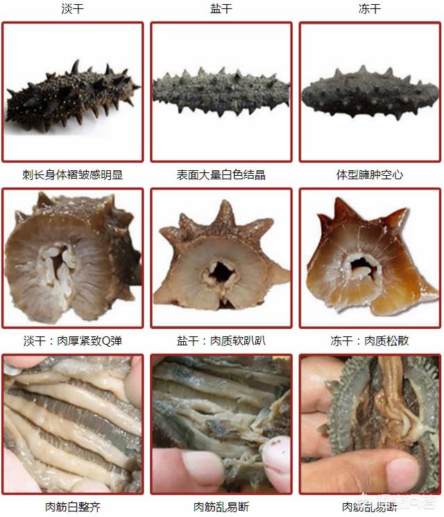色を見てみよう。純粋な天然ナマコは太くて厚みがあり、養殖ナマコは細長い。養殖ナマコは色も大きさも基本的に同じだが、天然ナマコは色も大きさも千差万別で、とげの程度も全く違う。また、砂糖干しや塩干しのナマコを安く売り、純粋な淡水ナマコと宣伝して消費者を欺く商人もいる。野生のナマコは海中のさまざまな場所で育ち、基本的に色は生育海域の岩や砂の色と同じで、採餌量や生育年数も異なるため、野生のナマコの形や大きさが決まり、飼育ナマコは同じ環境で生活しているため、ナマコの形は全く同じであり、純粋な野生のナマコではないことは間違いない。
