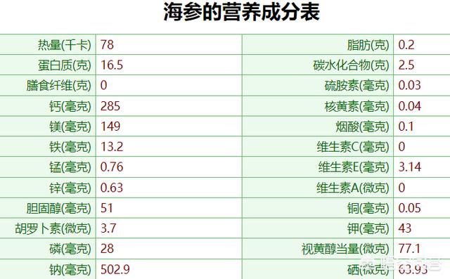 新鮮なナマコのタンパク質は16.5%(参考:中国食品成分表2009年第2版)であるのに対し、水に浸したナマコのタンパク質含有量はわずか6%(一部の業者はナマコを水戻ししすぎている)であり、ナトリウム以外の他の栄養素もセレンが63.93ug/100gと高い;