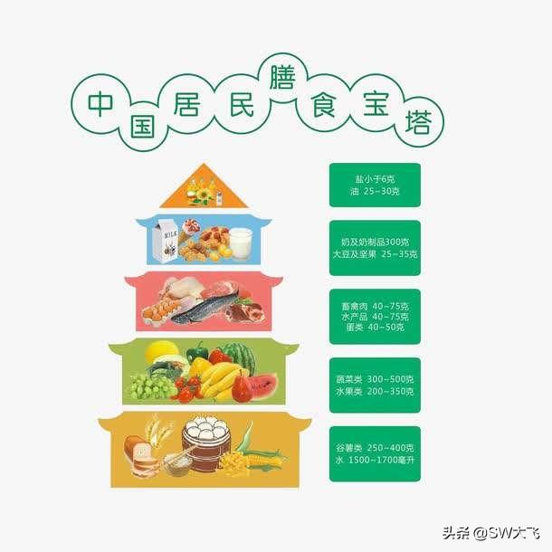 中国人のための食生活指針』に描かれた「食生活の塔」によると、穀物と穀類はリストの一番下にあり、最も消費されている。1日の推奨摂取量は250~400グラム。