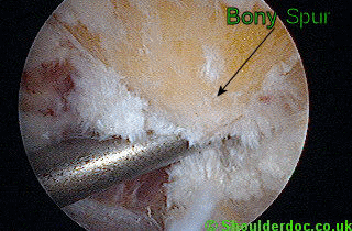 (下の1枚目の写真は明らかに骨棘が形成されている様子で、2枚目は肩のインピンジメントを誘発した骨棘を取り除く手術をした後の術後の写真です)