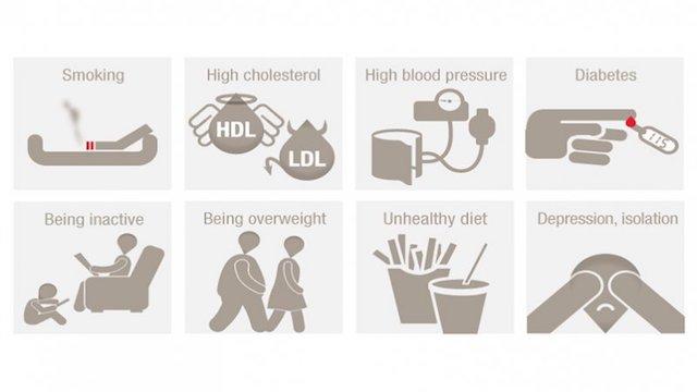 高血圧、脂質異常症(総コレステロールが高い、LDLコレステロールが高い、HDLコレステロールが低い)、過体重(または肥満)、高血糖(または糖尿病)、生活習慣の乱れ(喫煙など)、不合理な食事(高脂肪、高コレステロール、高カロリーなど)、運動不足、アルコールの過剰摂取、心理社会的要因など。
