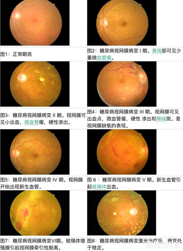 糖尿病性網膜症は失明の危険がある重大な病気ですが、糖尿病患者のほとんどは、発見が間に合い、定期的な治療を受ければ、失明の危険から逃れることができます。糖尿病患者には、ほとんどすべての眼病が起こる可能性がある。眼底血管腫、眼底出血、涙嚢炎、緑内障、白内障、硝子体混濁、視神経萎縮、黄斑変性、網膜剥離などである。つまり、眼科の重大な病気に属するのです。以下に糖網膜症の病期と各病期の眼底写真を添付します!
