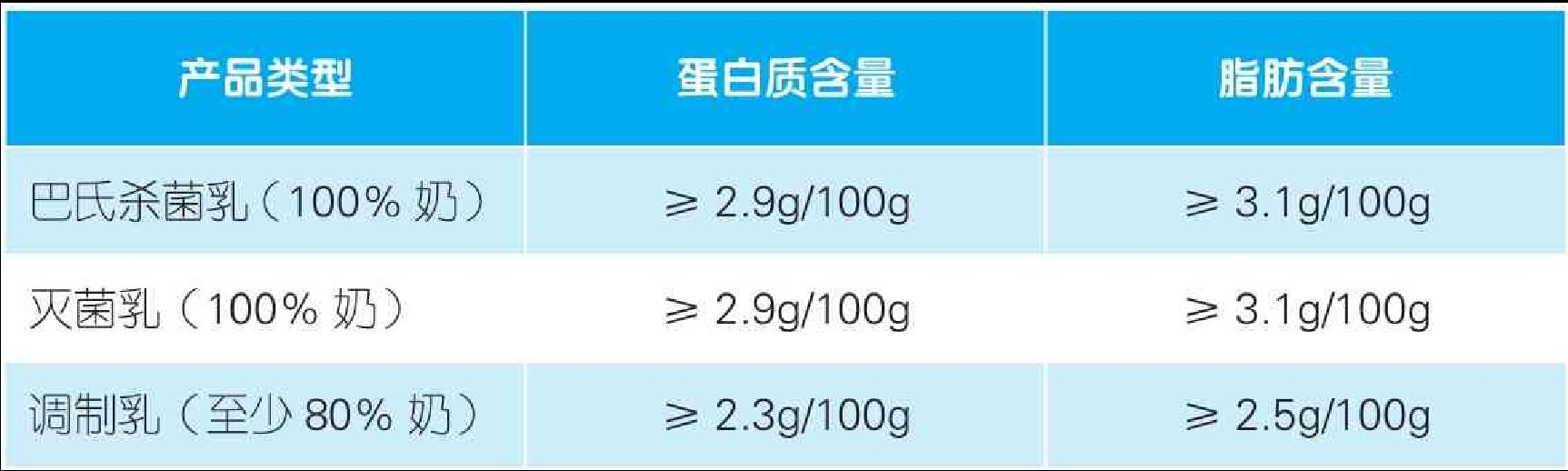 牛乳は通常、約12%の乾物と残りの88%の水分を含む。全乳は100gあたり約3.0gのタンパク質、3.6gの脂肪、4.6gの乳糖、0.8gのミネラルを含み、低脂肪乳は全乳の約半分の脂肪、脱脂乳は通常0.5%未満の脂肪を含む。市販されている牛乳の栄養成分規格は下表の通り。