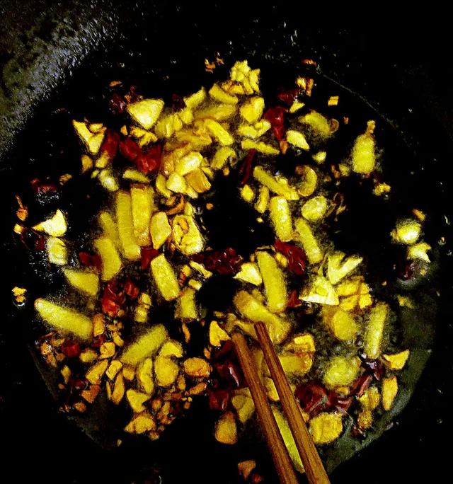 炒めるたびに、ニンニクを2、3片入れて包丁で刻み、赤唐辛子と生姜の塊を混ぜて一緒に刻む。