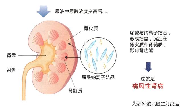 尿酸は人体のゴミの一種で、同様に腎臓から排泄される。痛風患者は血液中の尿酸が多すぎ、過飽和状態になると尿酸塩結晶を形成する。 このゴミが腎臓から排泄されると、腎組織に沈着する傾向があり、腎髄質や腎乳頭に尿酸塩結晶という形で現れ、その周囲を円形細胞や巨大細胞が取り囲んで反応し、痛風腎症になる。