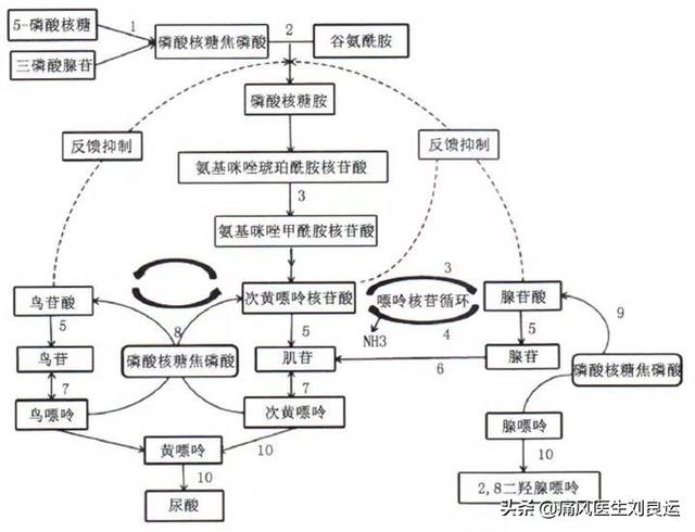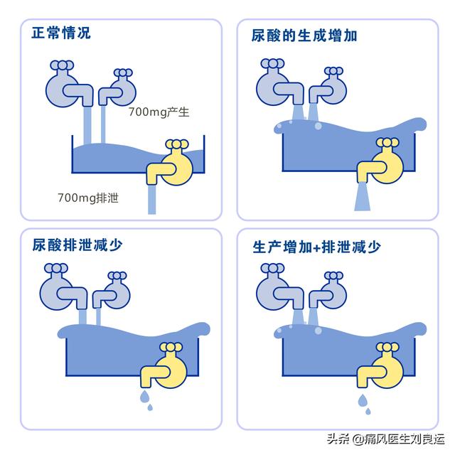 尿酸の80%は体内細胞の代謝に由来し、プリン体を多く含む食品(動物の内臓、魚介類など)からの摂取はわずか20%であるため、食事要因は痛風の原因の一部に過ぎない。