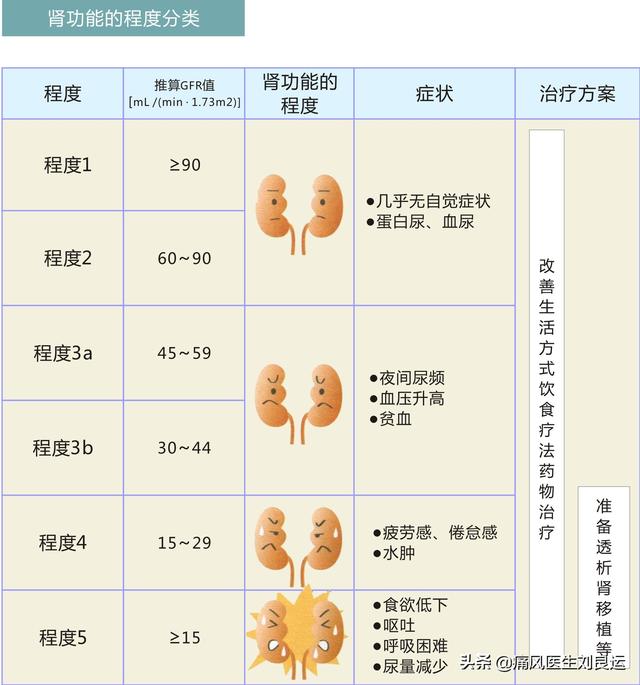 腎臓は人体で最も耐久性のある臓器の一つである。初期には症状が出にくい。人体の腎臓は左右それぞれなので、尿酸塩結晶の影響で腎臓の機能が半減しても、患者さんによってはまだ調子がよく、普段の食事や生活にはあまり影響がありません。腎臓の機能がさらに低下すると、病状が急変することが多く、腎臓の機能は悪化の一途をたどり、最終的に腎不全で死亡する患者は17%から25%に上ります。
