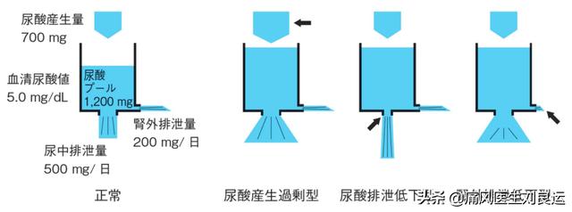 現在では、高尿酸血症は腎臓による排泄の低下に関係しているという研究もある。しかし、高尿酸血症の原因は比較的複雑で、排泄の問題に加えて過剰な産生もあるからである。