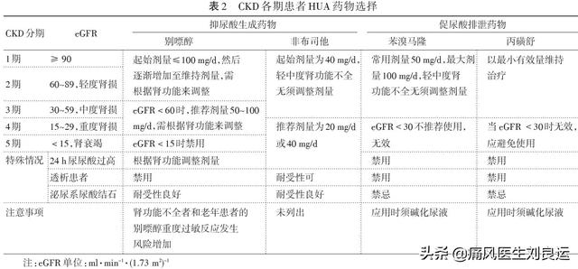 - 痛風患者の腎機能低下は尿酸降下薬の選択に注意を要する:痛風の場合、非薬物療法とともに薬物療法が必要である。急性痛風の期間は、COX-2阻害薬クラスの非ステロイド性抗炎症薬を同時に使用することをお勧めします腎障害によって引き起こされる警戒、または30~50ミリリットル/分のeGFRで、eGFR <30ミリリットル/分の量を減らすために医師によって処方されたコルヒチンの使用が禁止されている場合;尿酸降下治療は、アロプリンの使用は、eGFR <15ミリリットル/分の腎機能が低下した患者の量を減らすために注意する必要があります、フェブキソスタット開始用量は10mg/日、軽度から中等度の腎機能障害患者では用量調節は不要、ベンズブロマロンは尿酸結石患者では使用不可、軽度から中等度の腎機能障害またはeGFR>60ml/分の患者では用量調節は不要。尿をアルカリ性にすることが推奨されており、尿pHが6.2~6.9の範囲であれば尿酸塩結晶の溶解と尿中への排出が促進されるが、尿pHが7.0を超えるとシュウ酸カルシウムやその他の結石が形成されやすくなる。