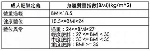 BMI<18.5はやせ型、18.5≦BMI≦23.9は普通型、BMI≧24は太りすぎ型、24≦BMI≦27.9は肥満型、BMI≧28は肥満型に属する。