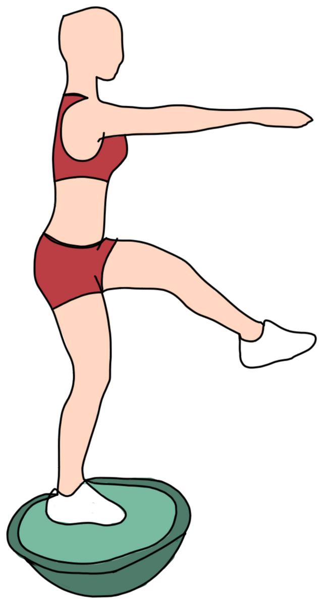 目を開けて片足立ちを1分間、目を閉じて片足立ちを1分間、バランスボールの上で両足立ちや片足立ちを行い、以下のように膝を小さく曲げて体のバランスを保つのが一般的だ。