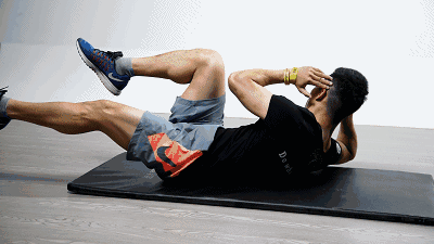 ステップ2:深呼吸をしてから息を吐き、腰、特に腰とお尻を地面に密着させたまま、上半身を持ち上げるように力を入れ、その動きを3秒ほどキープし、スタート動作に戻る。