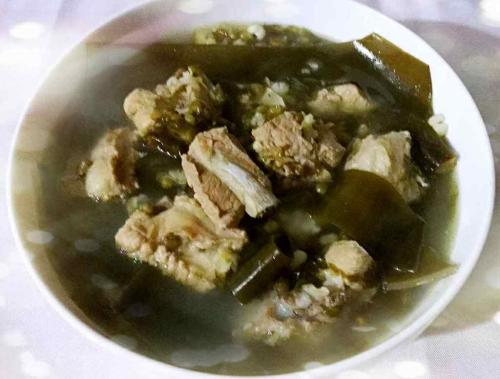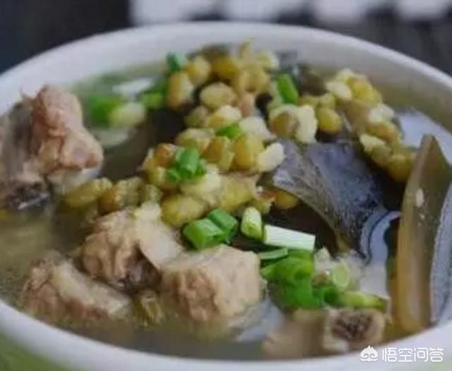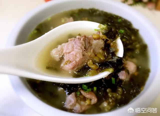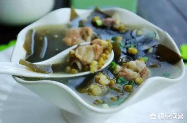 緑豆は清熱解毒、夏バテと利尿、昆布は湿と熱を取り除き浮腫を軽減し、豚バラ肉を一緒に煮込むと、甘くて新鮮な味になる。