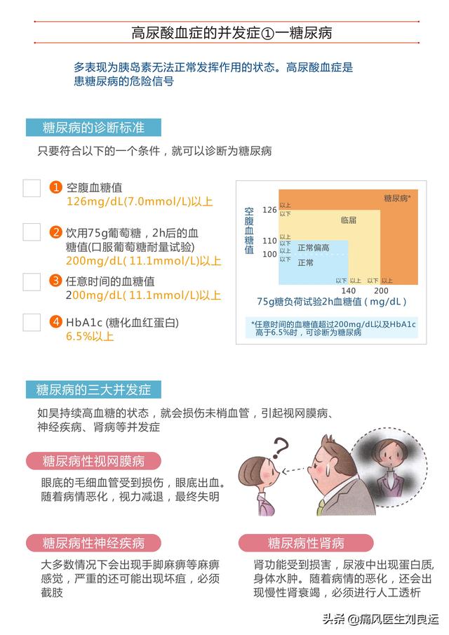 海外の研究によると、血中尿酸値の上昇は2型糖尿病のリスクを高める可能性があり、糖尿病の25%は高尿酸が原因であることが判明した。また、血中尿酸値が高い糖尿病患者は糖尿病性腎症を発症しやすい。