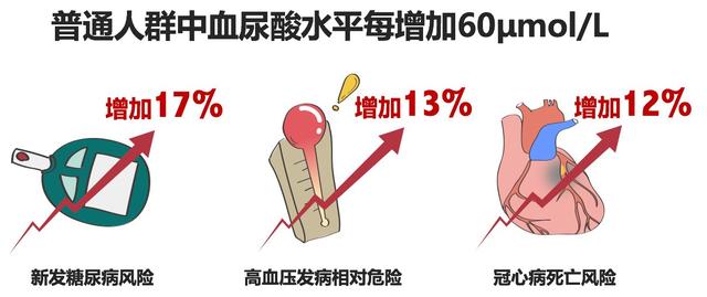 高尿酸血症は心血管イベントの発生を予測する独立した危険因子であり、平たく言えば、尿酸値が高いほど心血管疾患に罹患する可能性が高く、死亡率も高くなるということである。ある研究では、尿酸値が60μmol/L上昇するごとに、冠動脈性心疾患のリスクが正常値に比べ12%上昇することが示された。同時に、尿酸値が高い患者は、脳梗塞や心不全にかかる可能性も正常な人に比べて有意に高い。