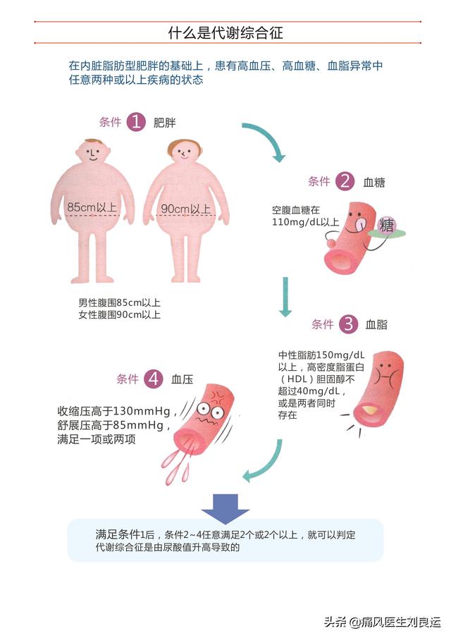 - (9) 肥満:肥満の人の多くは食べ過ぎで、プリン体の摂取量が自然に増え、肥満によって尿酸合成が亢進し、高尿酸血症になる。一般的な食習慣のため、体内に糖分や脂肪が蓄積し、尿酸排泄障害が生じ、同時にプリン体代謝も障害される。高尿酸血症の肥満患者では、血糖、血圧、血中脂質、血中尿酸の同時上昇がしばしばみられる。