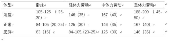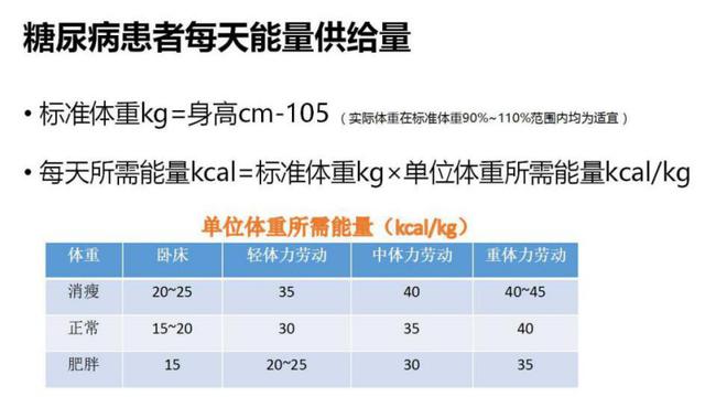 1日の総エネルギー摂取量を合理的にコントロールすることは、糖尿病食事療法の第一原則である。患者の自覚症状と理想体重に応じて、以下のことが可能である。下表を参照して、1日のエネルギー供給量[kJ(kcal)/kg]を推定する。