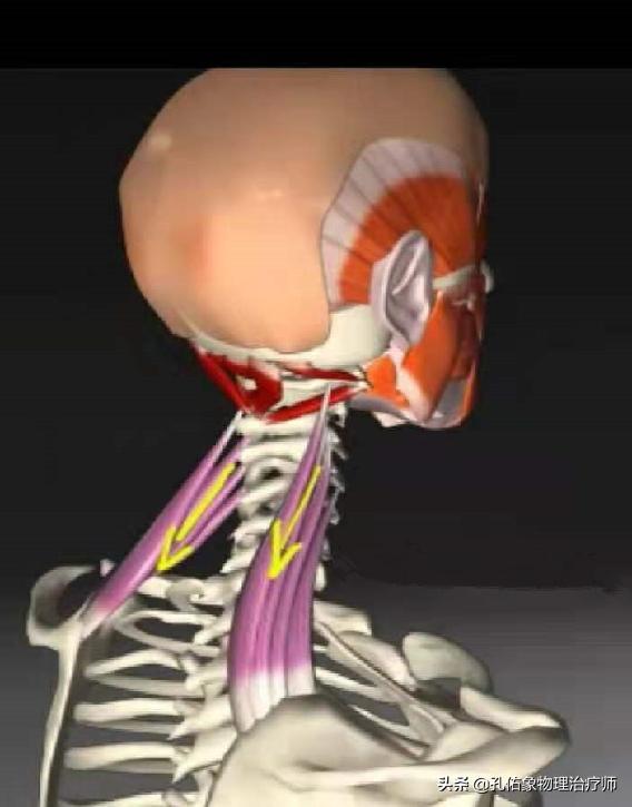 上に示したように、この筋肉は解剖学的に"肩甲挙筋".一端は頸椎1~4番の横突起に、もう一端は痛点のあるところ(肩甲骨の内側上角)に生えている。主な働きは以下の通り:ペインポイントの端が固定されたとき両側が強く縮んで短くなると、頭と首は後ろに傾く。長時間頭を下げていると、頭を前方に引っ張られるように徐々に引き伸ばされ、限界まで引き伸ばされると、それ以上引き伸ばされることができなくなり、静止端の肩甲骨の内側上角に痛みが生じる。。