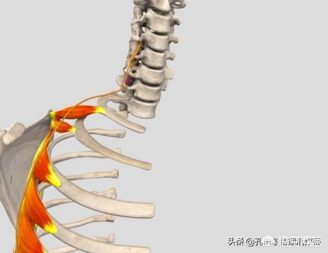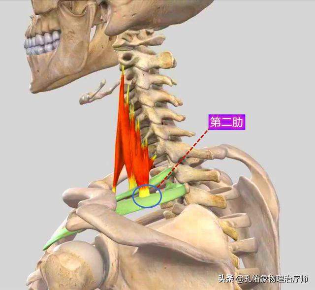 この筋肉、後斜角筋は、一端が頚椎6番と7番と横突起の上に伸びている。もう一方の端は裏側の第2リブにある。(b)それが、多くの場合頭を下げることで、この筋肉が短縮して緊張し、胸郭に痛みが生じる。.ここでは、肩甲骨に付着していないものの、大きな範囲では、私たちのこの位置での痛みは、非常に小さな痛みの限られたポイントではありません。多くの場合、誤診されがちな領域である。下図はそれを示している: