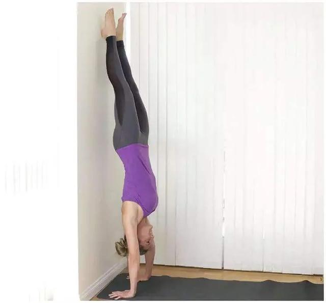 壁を使って、両手を頭の両側、壁から約20cmのところに置く。片方の足をまっすぐ伸ばし、もう片方の足を曲げ、曲げた方の足を押し上げて体を壁に逆さまにつける。両手を支えたまま体を一直線に保ち、鼻で呼吸をする。