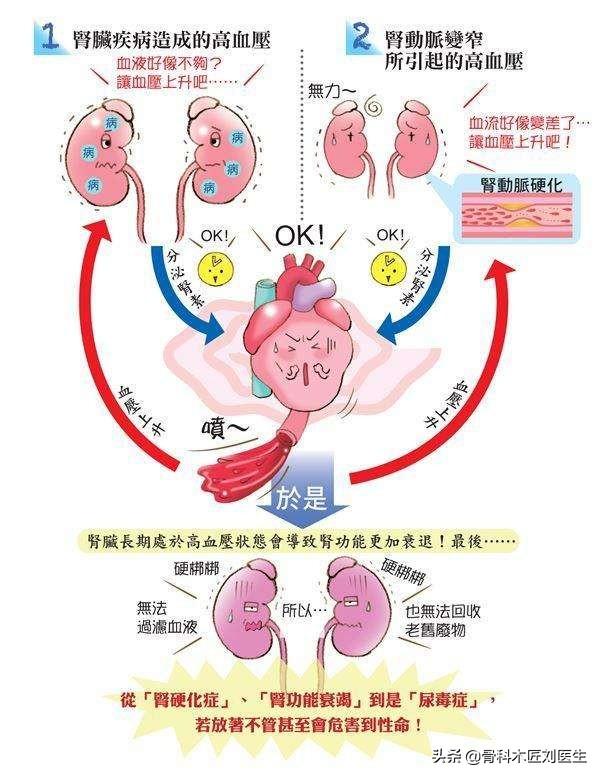 4.腎機能障害:高血圧は腎臓の血管を損傷し、腎臓への血液供給が不十分となり、腎機能の低下、多尿、夜間頻尿の増加、浮腫症状の出現を引き起こす。