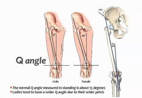女性は生殖の役割を担っているので、女性の骨盤は比較的男性の骨盤よりも広く、それはまた、膝関節の力線につながる、また、特定の異常を持っている、我々は通常、女性の骨盤は、男性の骨盤よりも広いです。膝蓋骨の中点から脛骨結節までの線が、大腿四頭筋の引きつけの立位線と交差する角度をq角という。正常なq角は男性で10~15°、女性で12~18°である。 q角が大きいほど、膝蓋骨は横方向に動く傾向がある。女性の場合、座屈角度が大きいほど、スクワット時の膝蓋骨と大腿骨後面との摩擦が大きくなるため、多くの女性が膝蓋大腿部外側に痛みを感じやすくなります。