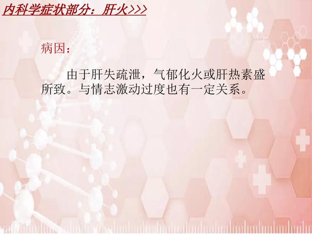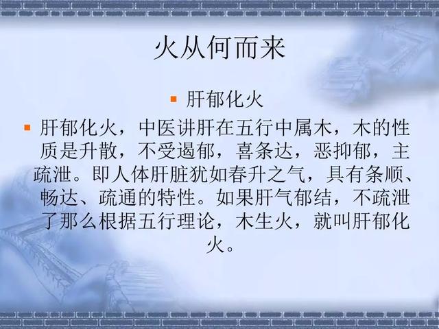 肝は感情を調整し、胆汁を分泌して消化を助けるなど、体の気血の運行を調整する役割がある。肝火は肝の気血のバランスが崩れた状態であり、怒りの後に肝気が急上昇し、気は陽であり、陽気は熱を持つと熱くなり、熱邪が肝に蓄積するのが主な病的変化であり、肝火の症状をまとめると以下のようになる。肝の気血は滞り、乱れ、火は充満し、体液を傷つける。全身的な症状反応を引き起こす。