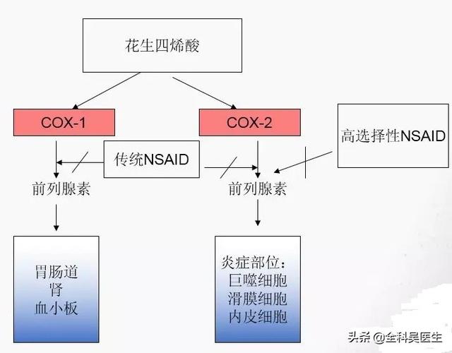 COXs(シクロオキシゲナーゼ)はCOX-1とCOX-2に分けられ、このCOX-1(シクロオキシゲナーゼ1)は胃腸粘膜を保護する作用があるため、アスピリンによるCOX-1の阻害は胃腸粘膜にダメージを与え、胃粘膜糜爛、胃潰瘍、さらには胃出血の発生を増加させる。胃潰瘍や胃出血さえも引き起こす。