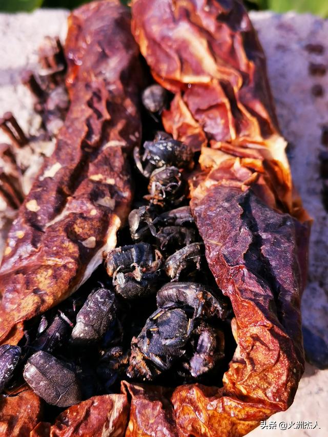 下の写真は、大量の虫の死骸を乾燥させたスイカの皮である。
