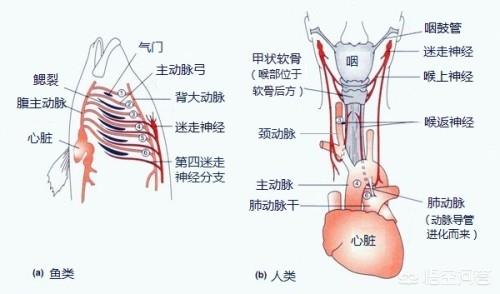 もともと魚の喉頭反回神経(第4迷走神経)と第6耳下腺動脈の血管はエラ部分に平行に分布しており、この構造は単純かつ迅速で、プラグマティズムの様式を備えていた。しかし、頸部の進化とエラの劣化に伴い、エラの最も後方にあった第6大動脈血管は徐々に後方(魚の後頭部方向)に移動し、現在のヒトの大動脈となり、この血管とともに発達した反回喉頭神経は後方(ヒトの場合は下方)にしか追随できなくなった。第4迷走神経(反回喉頭神経)のもう一方の端に付着している鰓弓(魚の下顎の後ろ側で鰓を支え、繋いでいる部分)は、咽頭へと進化した。