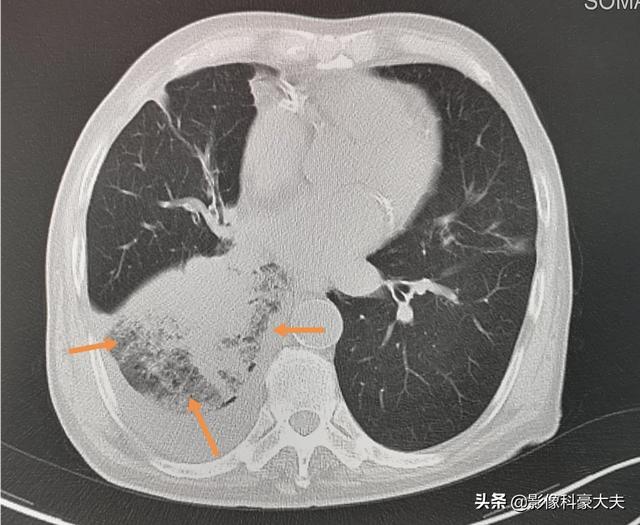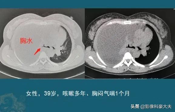 この患者はまだ39歳で、胸のつかえと息切れがあり、右肺の腺がんと診断され、多量の胸水が貯留し、右肺全体の機能が失われていた。このような重篤な状態は高齢者にやや多く、放置すればすぐに呼吸不全に陥る。幸いなことに、彼女は標的治療に感受性があり、胸水をコントロールしながら3年以上腫瘍と共存している。