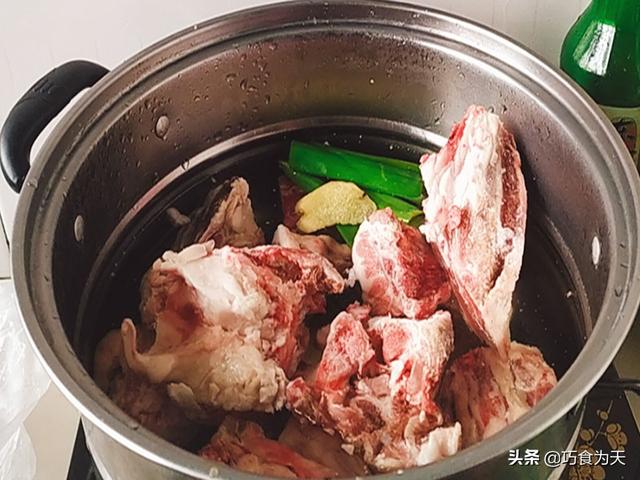 4.羊の骨とマトンに沸騰したお湯の別の鍋は、玉ねぎ、生姜、コショウ、アニス、クミン、スープ乳白色のマトンが柔らかく腐るまで、小さな火のシチューに大きな火沸騰を追加します。