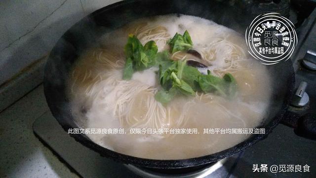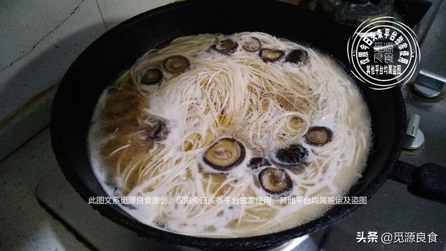 5、水の下で、鍋は大きな鍋に水、強火と沸騰させ、3-5浸したキノコを入れて、麺のスープの鮮度を高め、さらにしばらく調理し、麺に、麺が調理され、いくつかのソフトと腐った後、ボウルに、麺のスープ、私はその後、白菜を少し入れて、キノコの命を破るために調理した後、麺と一緒にキノコをボウルに入れます;