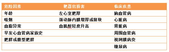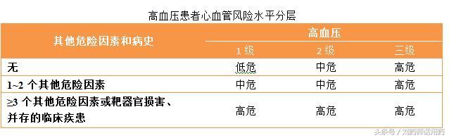 高血圧リスク層別化プロジェクトの内容に基づいて、高血圧患者は低リスク層、中リスク層、高リスク層に分類することができる。詳細は下の表を参照:
